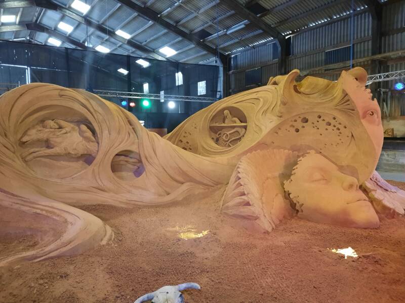 Veel winkeltjes zijn open op zondag en er lopen best veel mensen rond. Mondkapjes zie je bijna niet, alleen bij het openbaar vervoer. We vinden de plek, waar de zandsculpturen zijn gemaakt, en gaan naar binnen. Prachtige dingen van zand!!