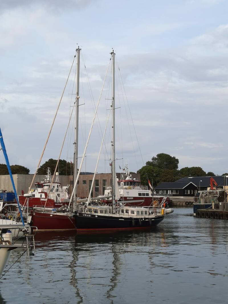 Voor Klintholm haven strijken we de zeilen en vinden een plekje vlak bij de vissershaven. Bij een ommetje door de haven zien we dat er een Noordkaper binnenkomt. Het is de FRAM die we in Makkum hebben bekeken maar voor ons te laag was. De toenmalige eigenaar vertelde ons dat er in de loods een NK 43 te koop lag. Onze Dutch Rose!