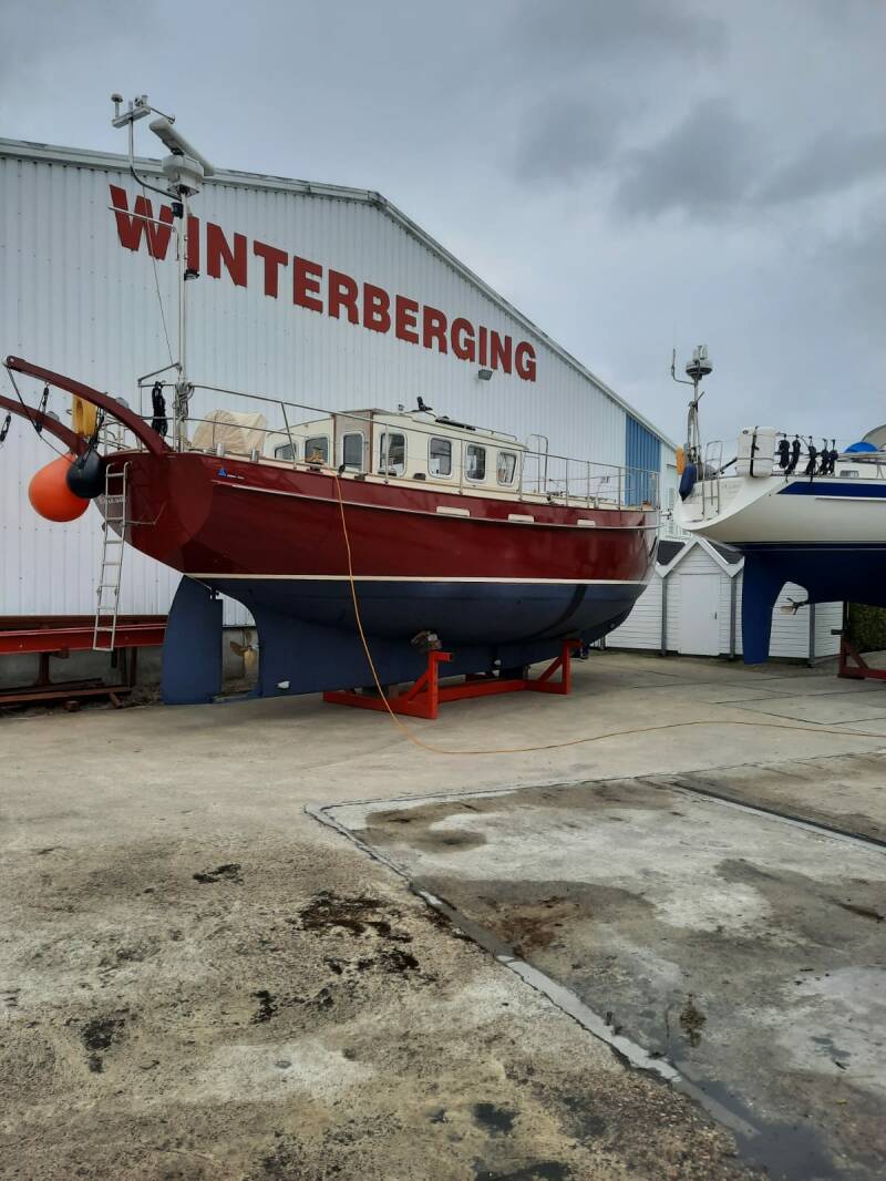 Vandaag 12 maart was het zover. Ons schip werd naar buiten gereden. Het staat nu op de wal bij de winterberging. Het is de bedoeling, dat de Dutch Rose a.s. dinsdag 16 maart te water zal worden gelaten.