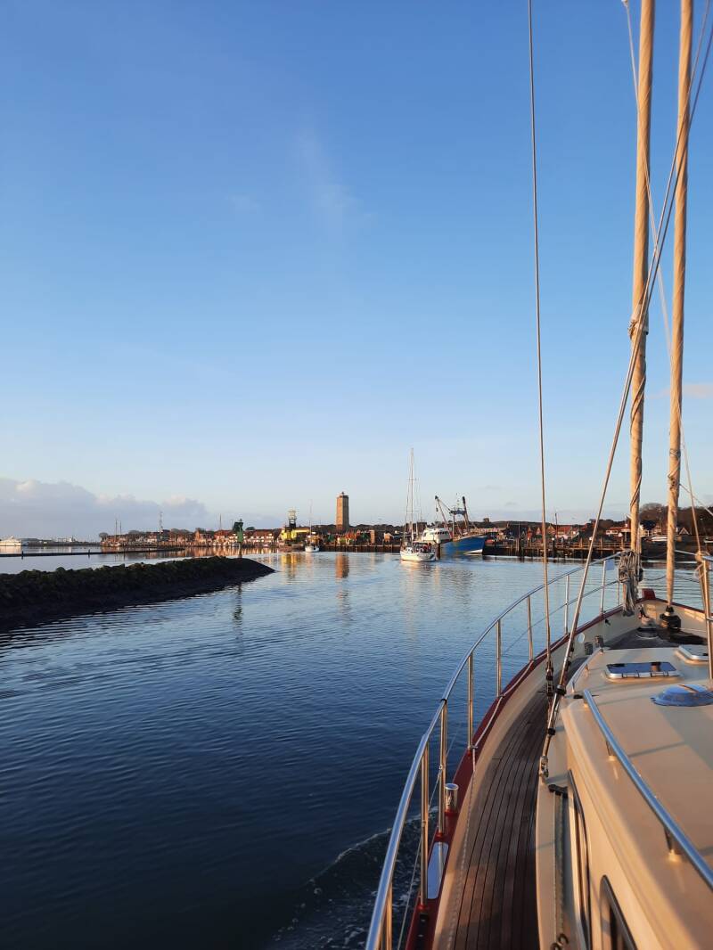 Na 3 heerlijke weken op Terschelling vanmorgen naar Harlingen gevaren. De steiger was spekglad en natte delen op het dek ook. Gisteren nog een dag met veel wind en regen maar vannacht ging de wind liggen.