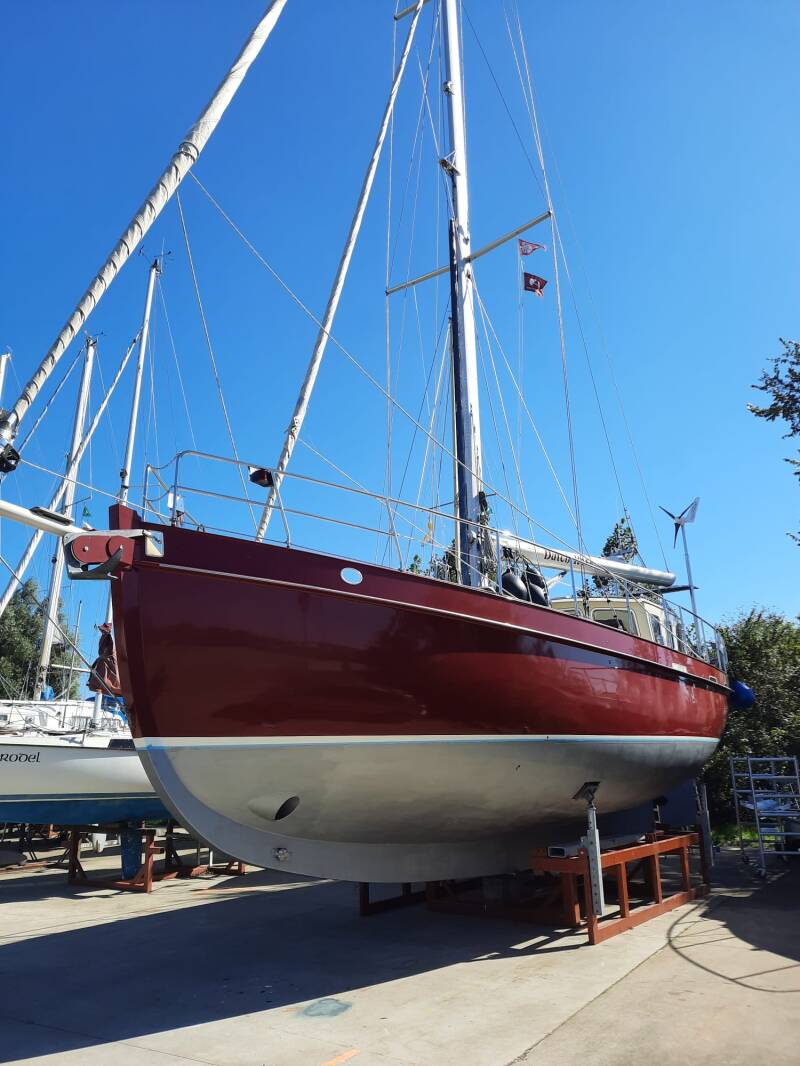 Daarna is de onderkant in de antifouling gezet. Het schip is ook goed gepoetst, zodat de romp wel een spiegel lijkt.