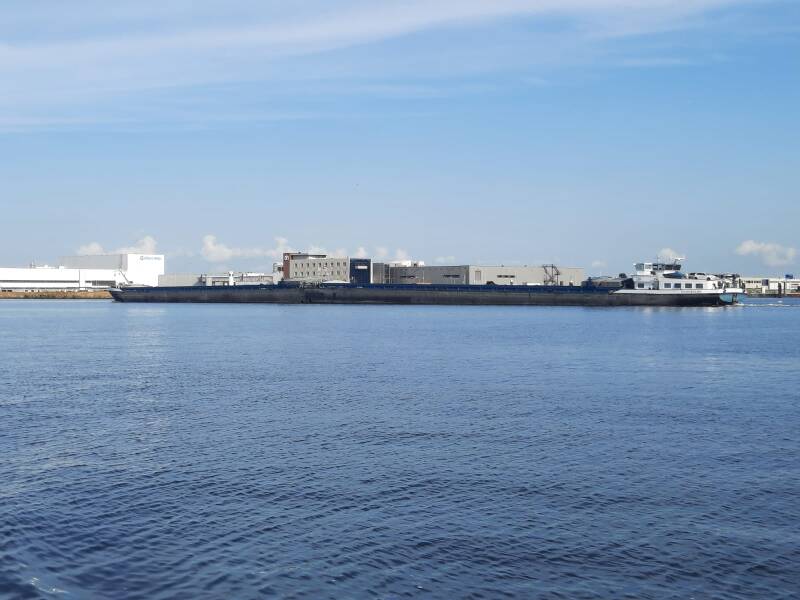 Grote duwbakken, slepers en kust- en binnenvaart komen we tegen of halen ons in. Je komt ogen te kort. Voor de Oranje sluis die drie keer per uur opent moeten we even wachten.