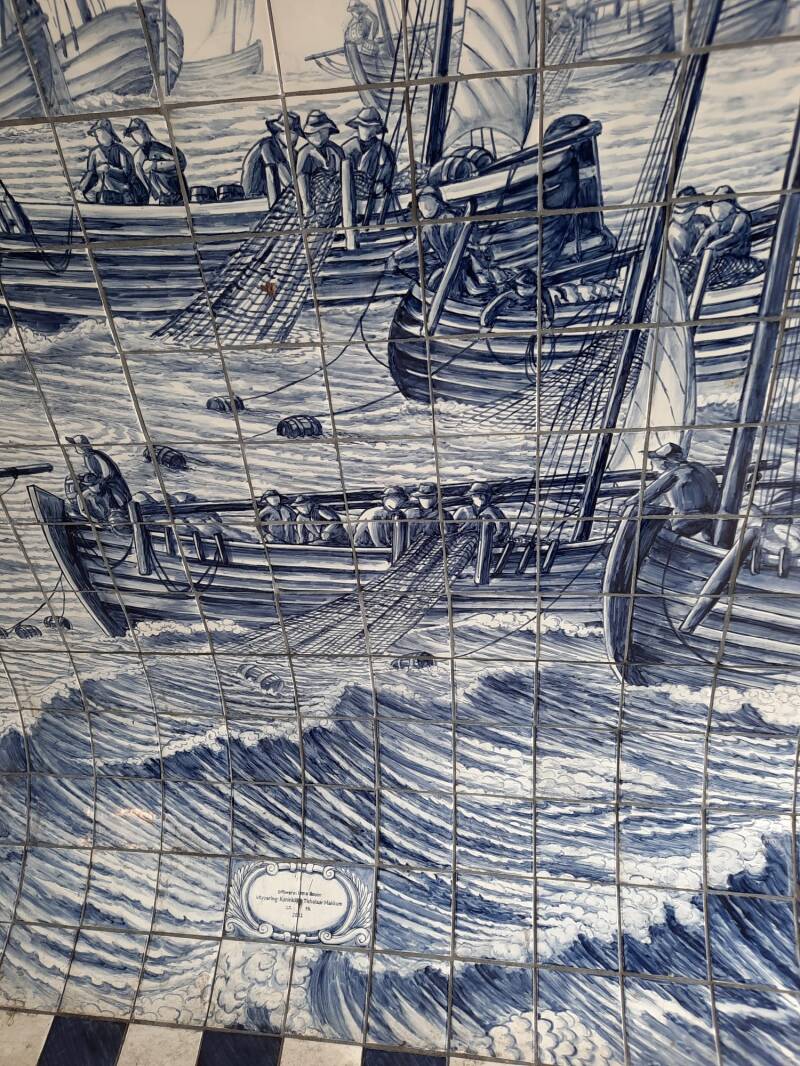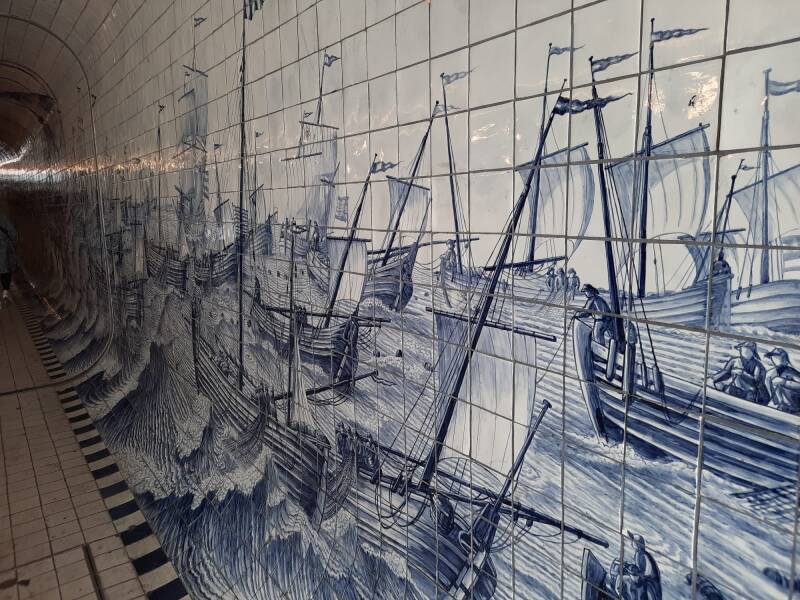 We hebben de tunnel onder het station met tegels uit Makkum ook gevonden. Het is een heel groot tableau met zeilschepen en veel vissers!