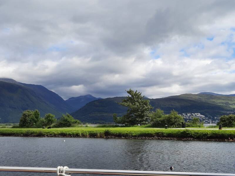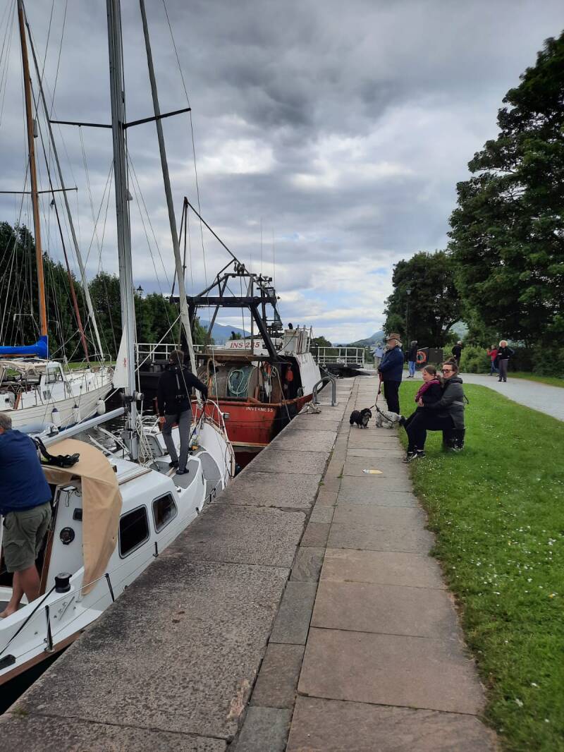 We liggen nu in het Bassin voor de laatste sluis van het kanaal. Tussen de bergen en de stoomtrein in.