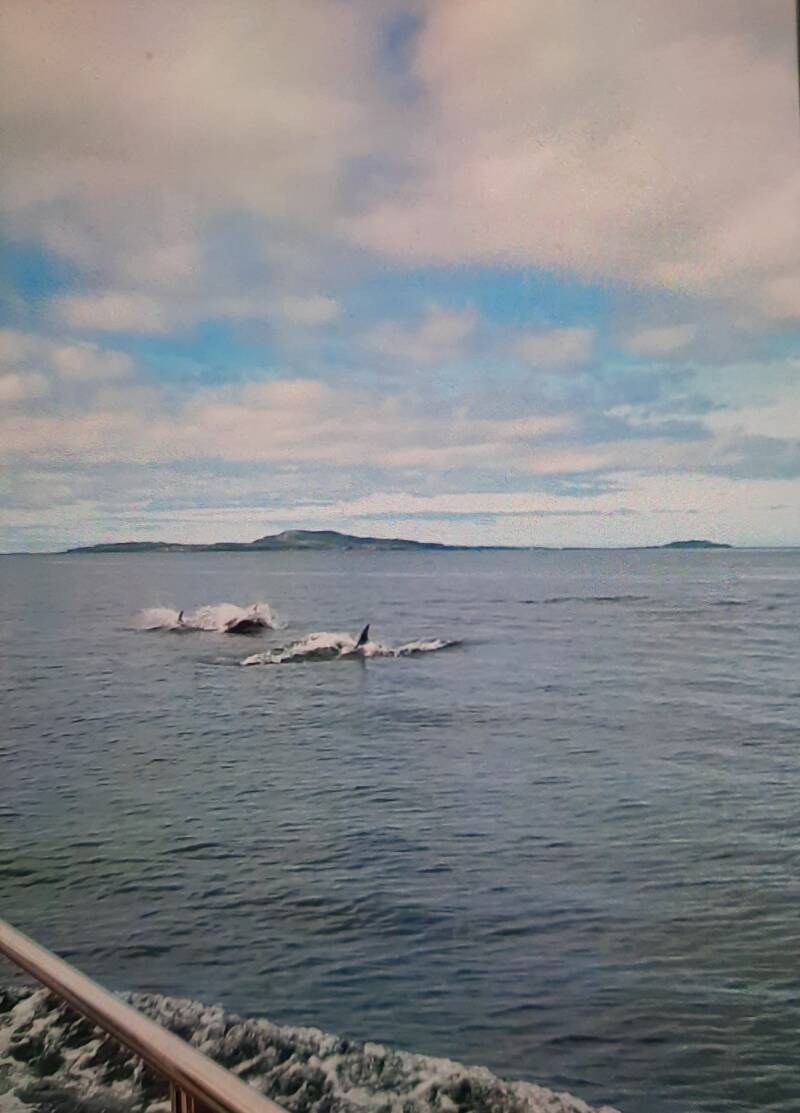 Als we weg varen hangen er nog zo'n 10 zeehonden op de rotsen. Als we de vuurtoren voorbij varen komt een groep dolfijnen bij ons langs. Ze gaan onder de boot door en springen zo nu en dan helemaal uit het water. Geweldige beesten en prachtig om te zien.