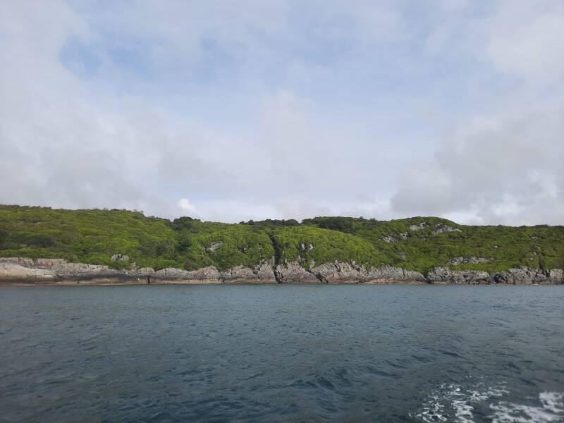 De kust is erg rotsig en woest. Ook een stuk met scheve platen.