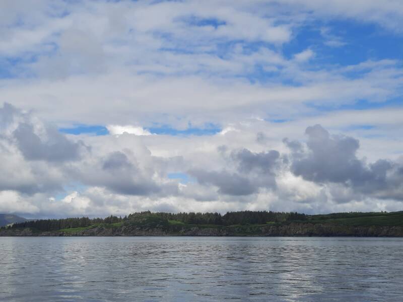 Als we de hoek om zijn komt er een bui aan en de veerboot zoekt de luwte op! Dat doen wij ook maar er komen nog een paar dikke golven over! Zoveel water hebben we nog niet over gehad! Alle luiken zijn goed dicht en alleen buiten worden we nat!