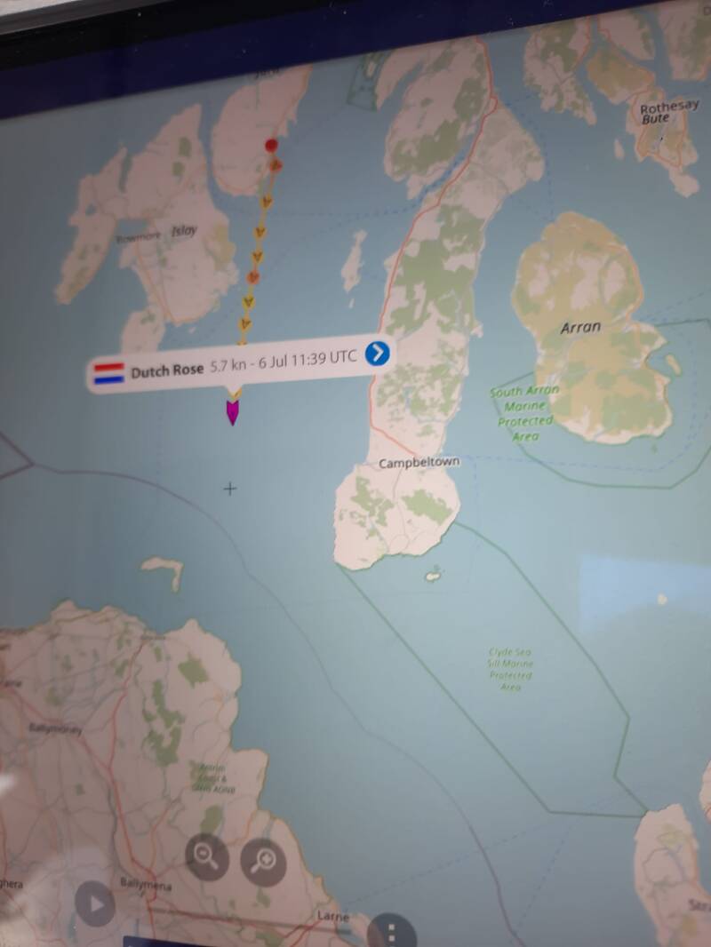 In het begin wind uit West en Oost. Ook wel even geen wind maar als er een buitje langs komt gaat het wel weer. Vreemde stromingen maar als we onder Schotland komen een heerlijk windje.
