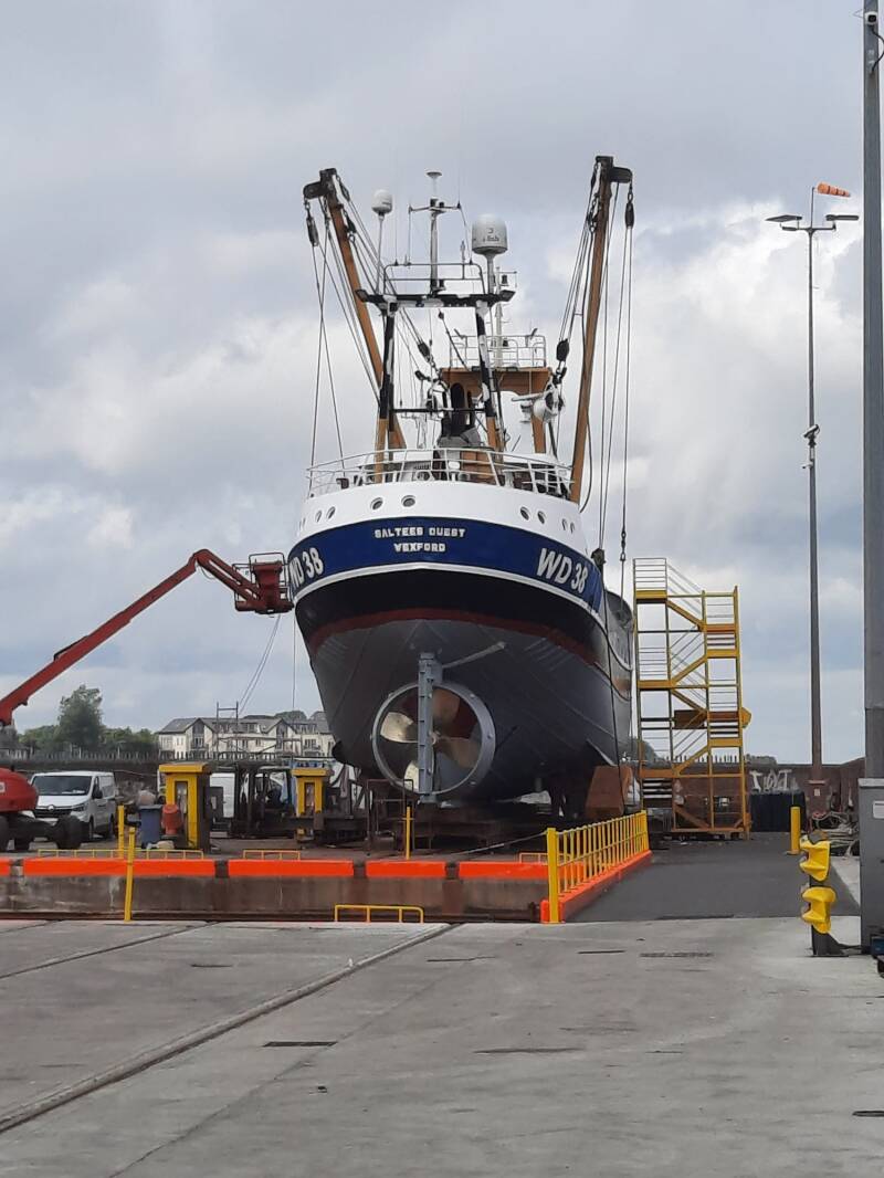 We zien een vissersschip met een blinkende nieuwe schroef op de helling. Er gaan wel rails naar toe, maar er zit een gat tussen. Daar kunnen rails tussen gezet worden!