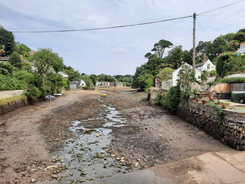 Wij gaan rond 11 uur met Roosje naar de kant. Naar het dorp varen we langs de drooggevallen rotsen. Er liggen héél veel boten en bootjes op een mooring of voor anker. Er is ook een ponton voor rubberboten en ander klein spul. Een paar buren gingen ook naar de kant maar die liepen snel vast. Wij gingen met een boog naar de ponton en dat ging bijna goed tot het eind. Daar stond ook geen water meer.