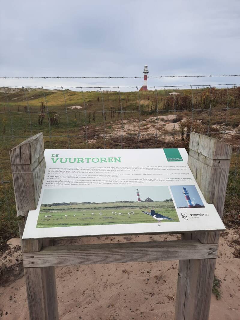 Op de overkant staat een vuurtoren en ernaast is een groot defensie terrein met barakken. Er lopen ook wat schapen rond.