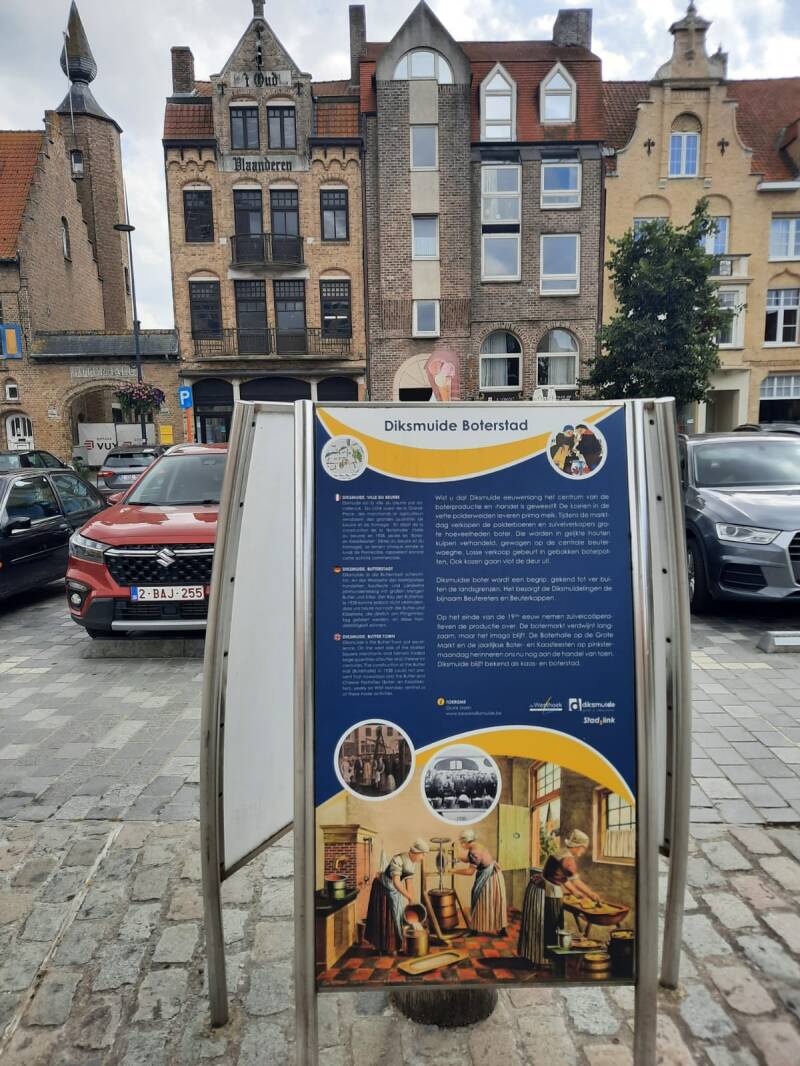 Op het infobord staat te lezen: Diksmuide is eeuwenlang het centrum van de boterproductie en -handel geweest. De koeien in de vette polderweiden leveren prima melk. Tijdens de marktdag verkopen de polderboerem en zuivelverkopers grote hoeveelheden boter. Die worden in geijkte houten kuipen verhandeld, gewogen op de centrale boterwaag. De verkoop van losse boter gebeurt in gebakken boterpotten. Ook kazen worden vlot verkocht.
