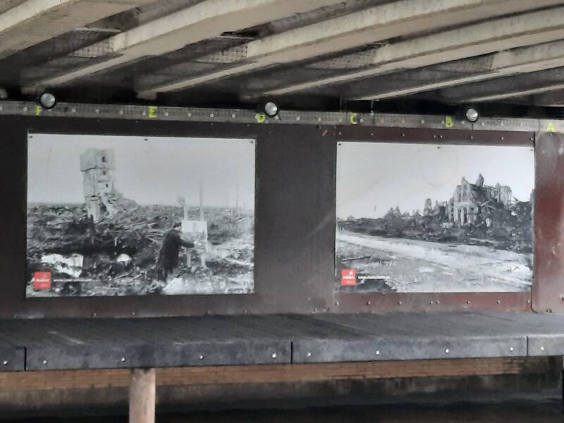 Onder een brug zijn wat foto's van een met de grond platgemaakte stad.