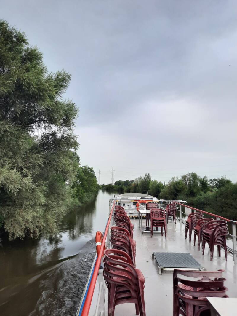 We gaan terug met een boot. Wij zijn de enige gasten met een fiets. Het vaartochtje van 1½ uur is in de regen. Helaas geen weer om bovenop te zitten maar we komen zo wel bijna droog terug bij onze Dutch Rose. Filmpje