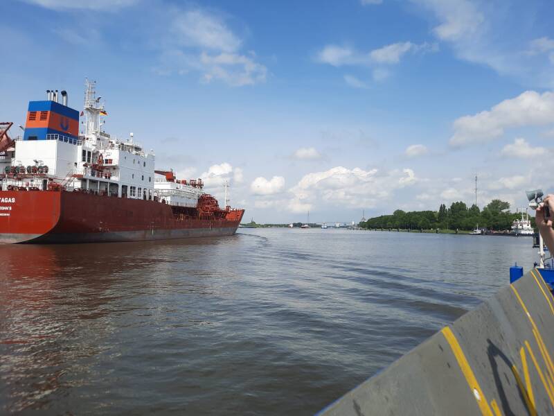 We fietsen naar de 1e pont, maar die vaart niet. Dan nemen we de volgende bij Burg. Er is niet veel grote scheepvaart maar als we de pont bij Brunsbüttel nemen is het even druk. Grote schepen gaan uit of naar de sluis.