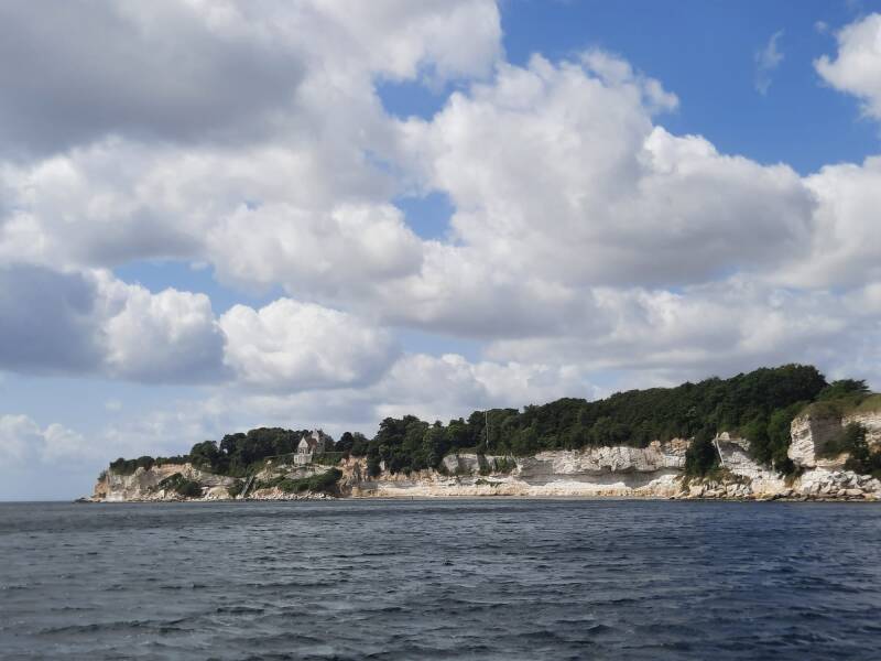 De zon verdwijnt af en toe achter de wolken, maar als we langs Stevns Klint varen schijnt de zon weer en de wind blijft waaien!