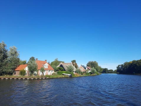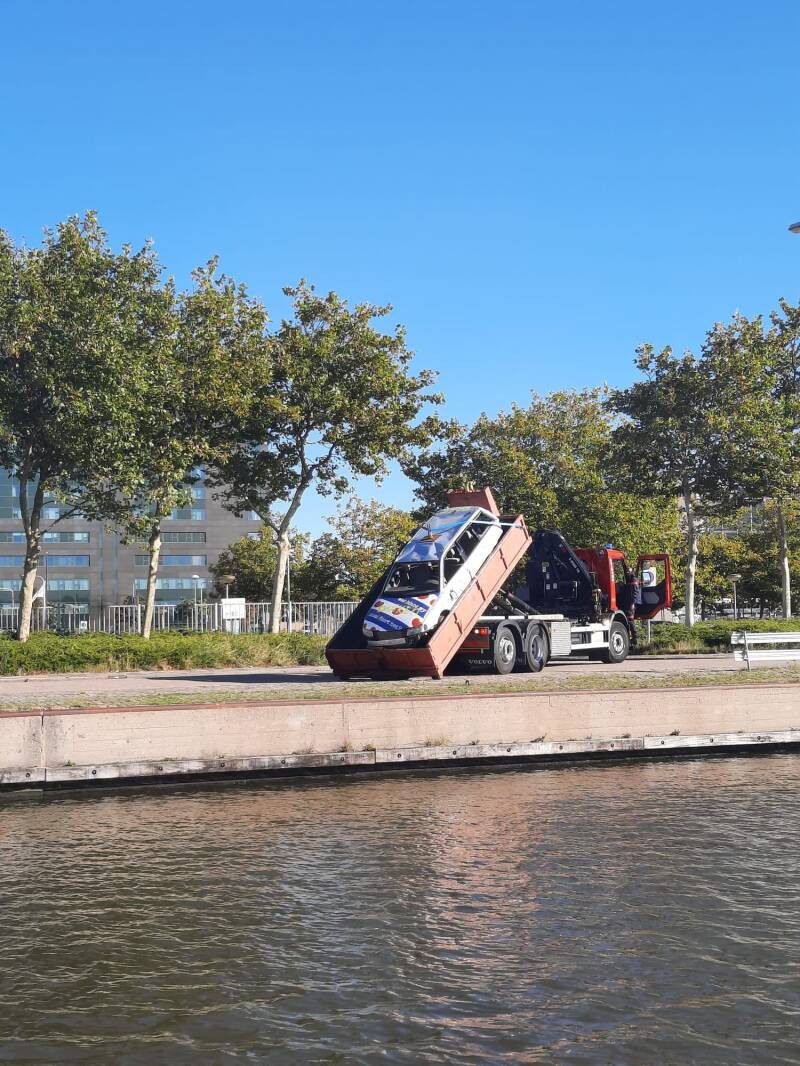 De brandweer ging oefenen met een auto, die gespoten was in de kleuren van de Friese vlag. We voeren langs de huizen tegenover de Froskepôlle.