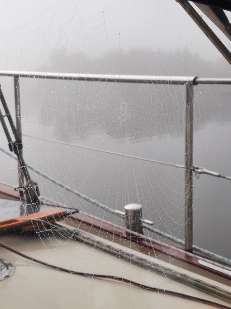 Vandaag hangt de mist die de wereld tot half 12 heel klein maakt. Nu kunnen we het web voor het raam goed zien, wat een kunstwerk!